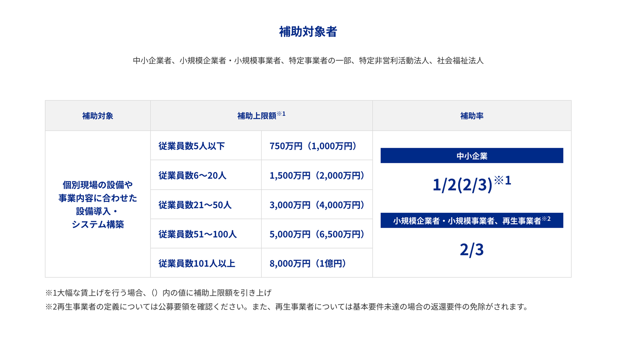 | 補助上限額 | 従業員数に応じて異なる(例:従業員5人以下で750万円) |