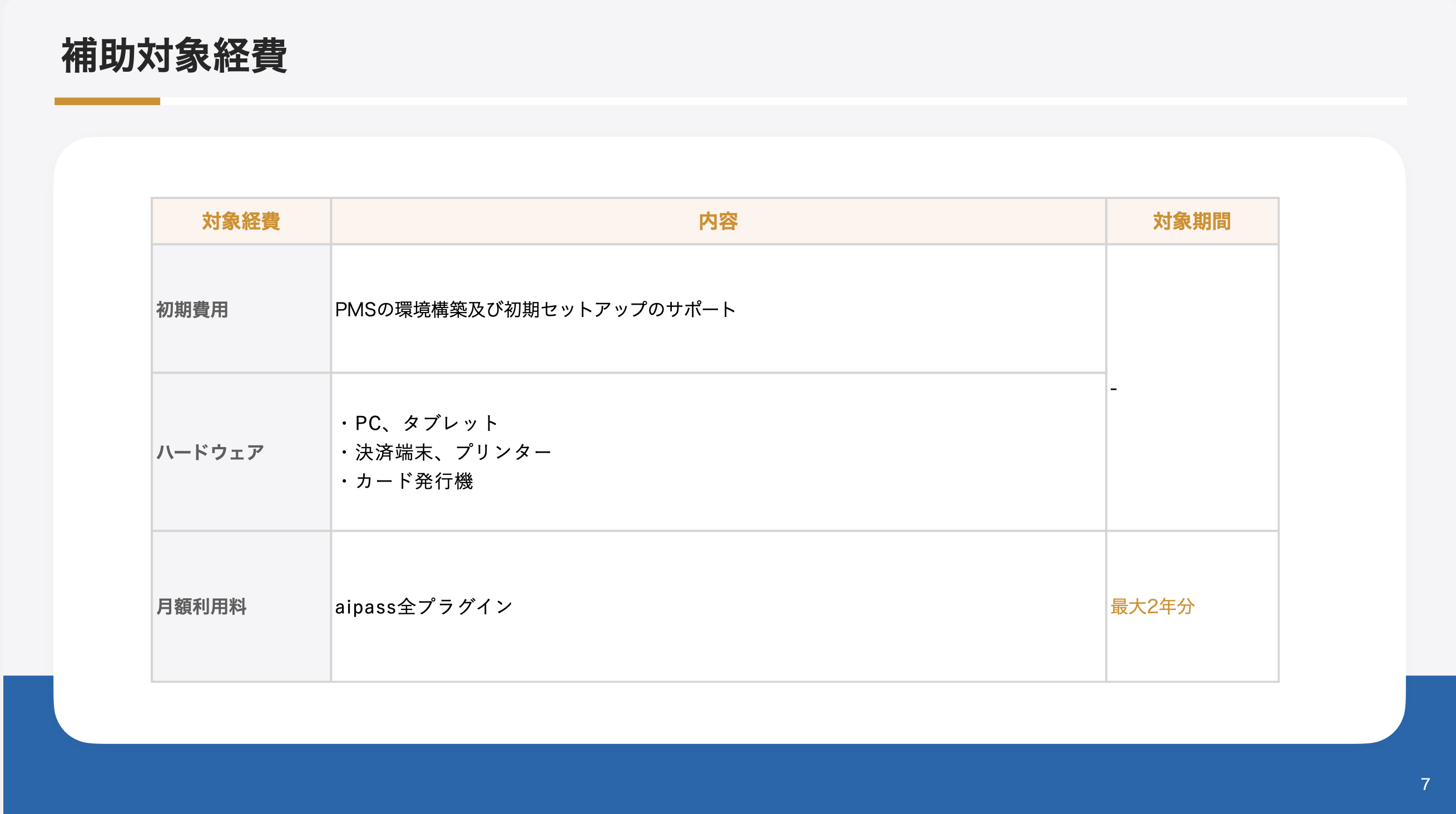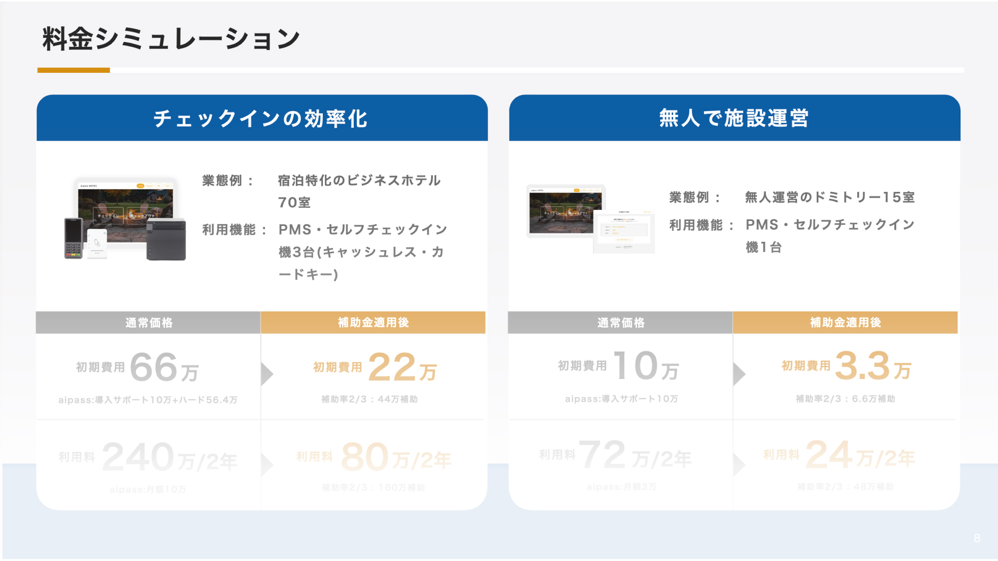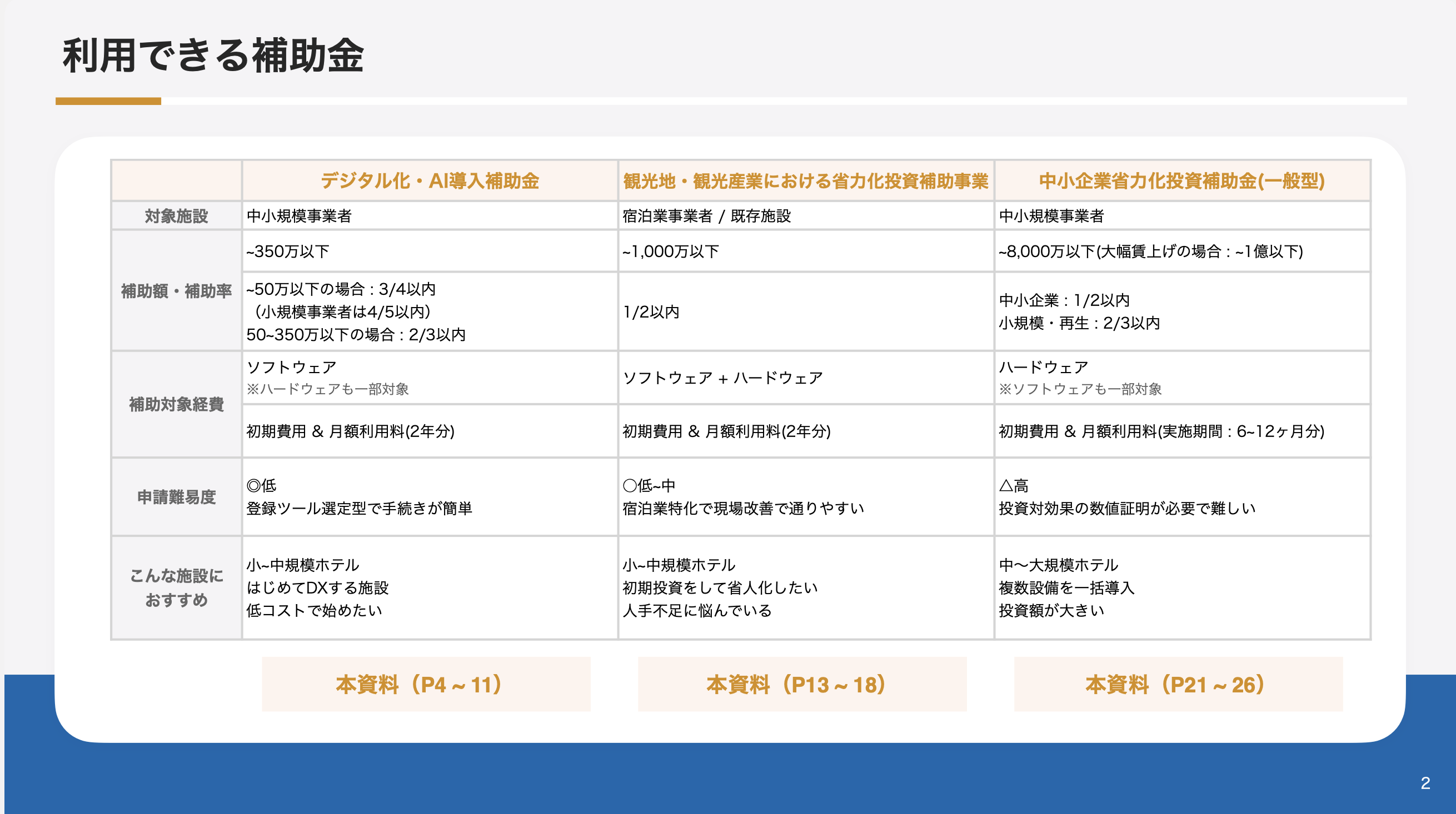 この資料でこんなことが分かります ・ 利用できる補助金について ・ デジタル化・AI導入補助金 ・ 観光地・観光産業における省力化投資補助事業 ・ 中小企業省力化投資補助金(一般型) ・ 申請対象者 ・ aipassで利用できる申請枠 ・ 料金シュミレーション ・ 申請手順